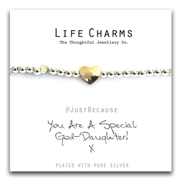 Pure silver plated charms on 5mm beaded stretch bracelet. This bracelet comes presented in a luxury gift box, with a #JustBecause You Are A Special God-Daughter. All jewellery is finished to the highest standard & E-coated to prevent any tarnishing.