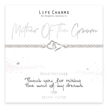 Delicate silver beaded bracelet from our Just Because Collection with joined heart charm and Life Charms logo tag. Presented on a card with wording 'Thank you for raising the man of my dreams' inside. Luxury gift box included.