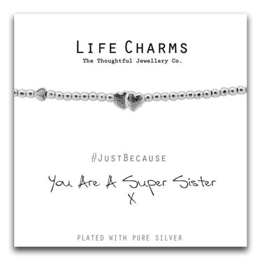 Pure silver plated double heart charm bead, on 5mm beaded stretch bracelet. The bracelet comes presented in a luxury gift box, with a Just Because ‘You Are A Super Sister’ card. All jewellery is finished to the highest standard & E-coated to prevent any tarnishing