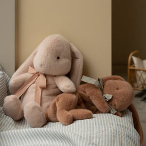 This bunny comes in very soft and unique plush fabric. It has a beautiful bow around the neck. It has a very sweet look and will soon be someone's very best friend