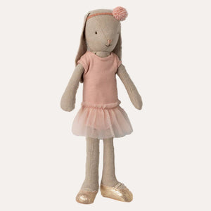 The well known Maileg bunny dressed up as a ballet dancer. It wears a rose colored suit, tulle skirt and ballet shoes