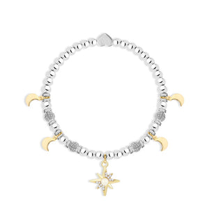 Wrap up Christmas magic with our charms bracelet presented inside a luxurious, velvet-lined hat box. Beautiful silver beaded bracelet, adorned with sparkling gold stars and moons charms designed to bring festive sparkle and joy to any wrist. Nestled inside a round hat box with the message "Sparkle & shine this Christmas", it's ready to gift straight out of the box, making it a meaningful and stylish present for someone special. Bracelet measures 17.5 cm with room to stretch. E-coated for added protection against tarnishing. Hypoallergenic and crafted to the highest standard.