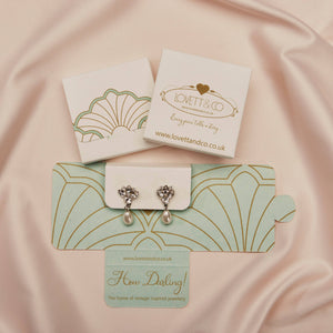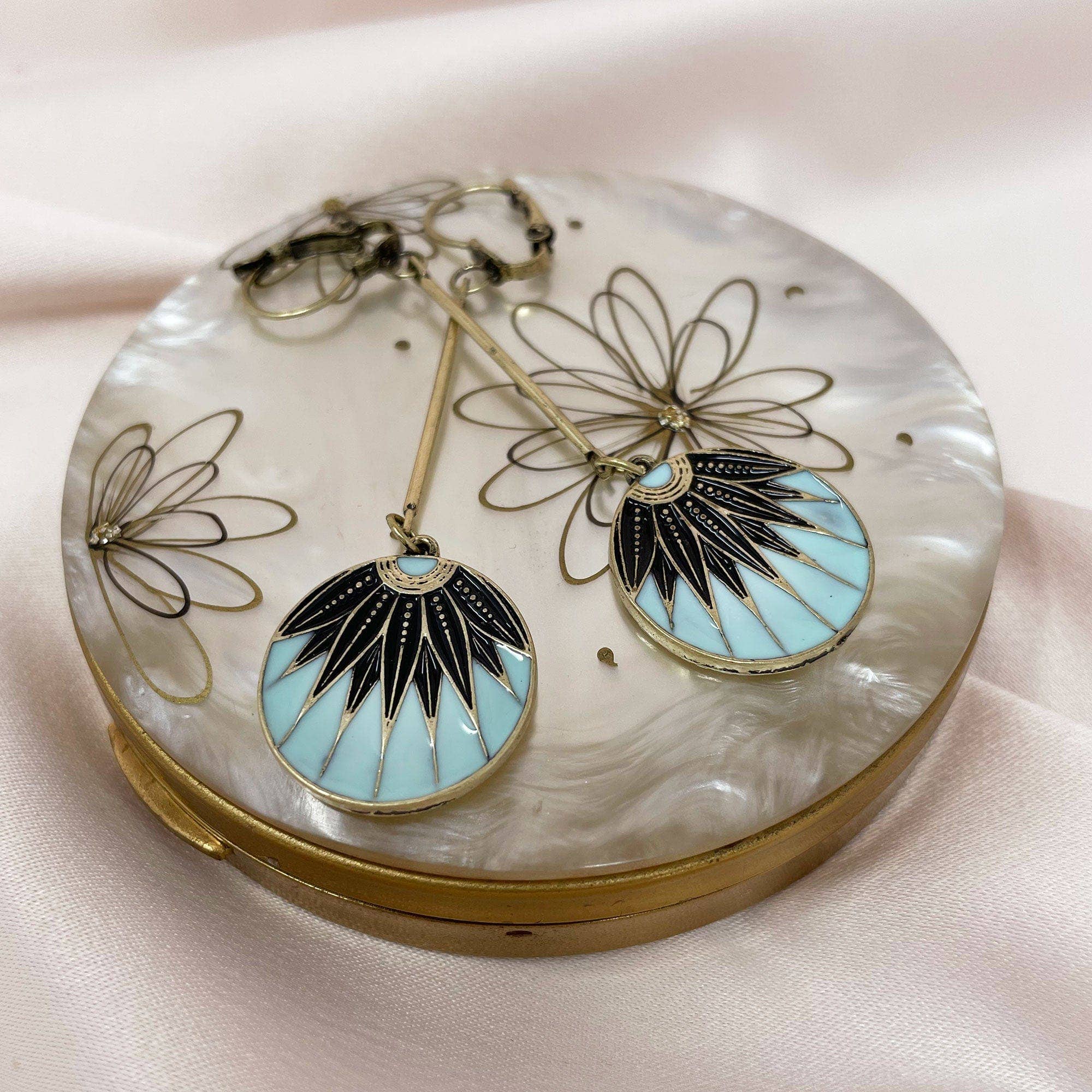 Inspired by an original 1920s compact mirror case, our emerald blue drop earrings are carefully hand painted with enamel and are perfectly balanced. These vintage art deco earrings come in other Titles and were shortlisted for Gift of the Year.