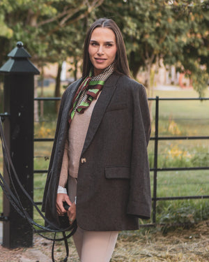 Emma is a classic satin scarf with a bold green and brown geometric print. Perfect for adding a pop of colour — wear it around your neck, in your hair, or tied to a bag.