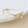 Faux gold plated and white bead bracelet with crystal detail quatrefoil charms featuring mother of pearl inlay. Fastened with a lobster clasp and extension chain