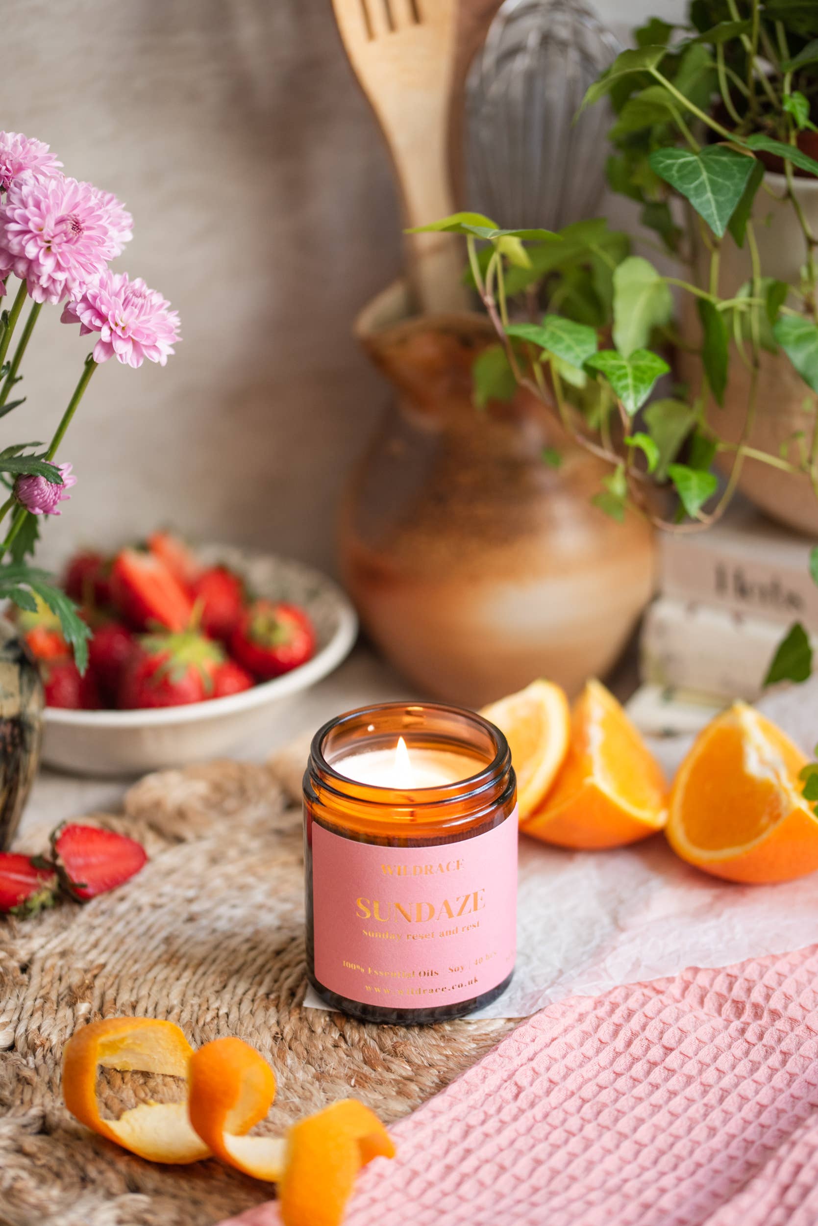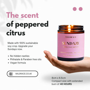 Reset with Sundaze — the candle designed to complement your Sunday ritual. Crafted with 100% pure essential oils and a custom blend by Wildrace, this exclusive fragrance is unlike any other. The bright, invigorating notes of peppered orange create a refreshing and subtly spicy aroma, balanced with just the right touch of fruitiness.