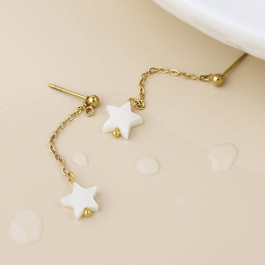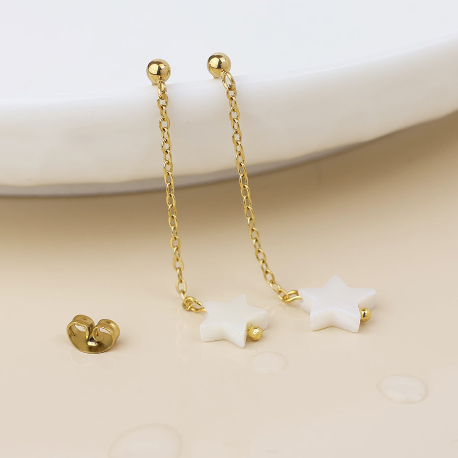 Stainless steel waterproof 14k gold plated bead stud and chain earrings with white star drops