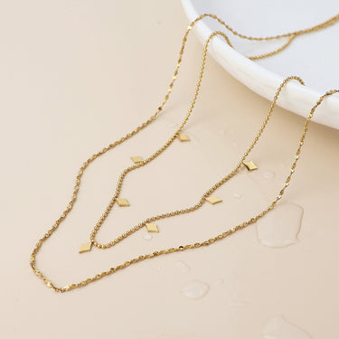 Stainless steel waterproof 14k gold plated mixed chain layered necklace with tiny diamond shape 14k gold plated charms, fastened with a lobster clasp and extension chain